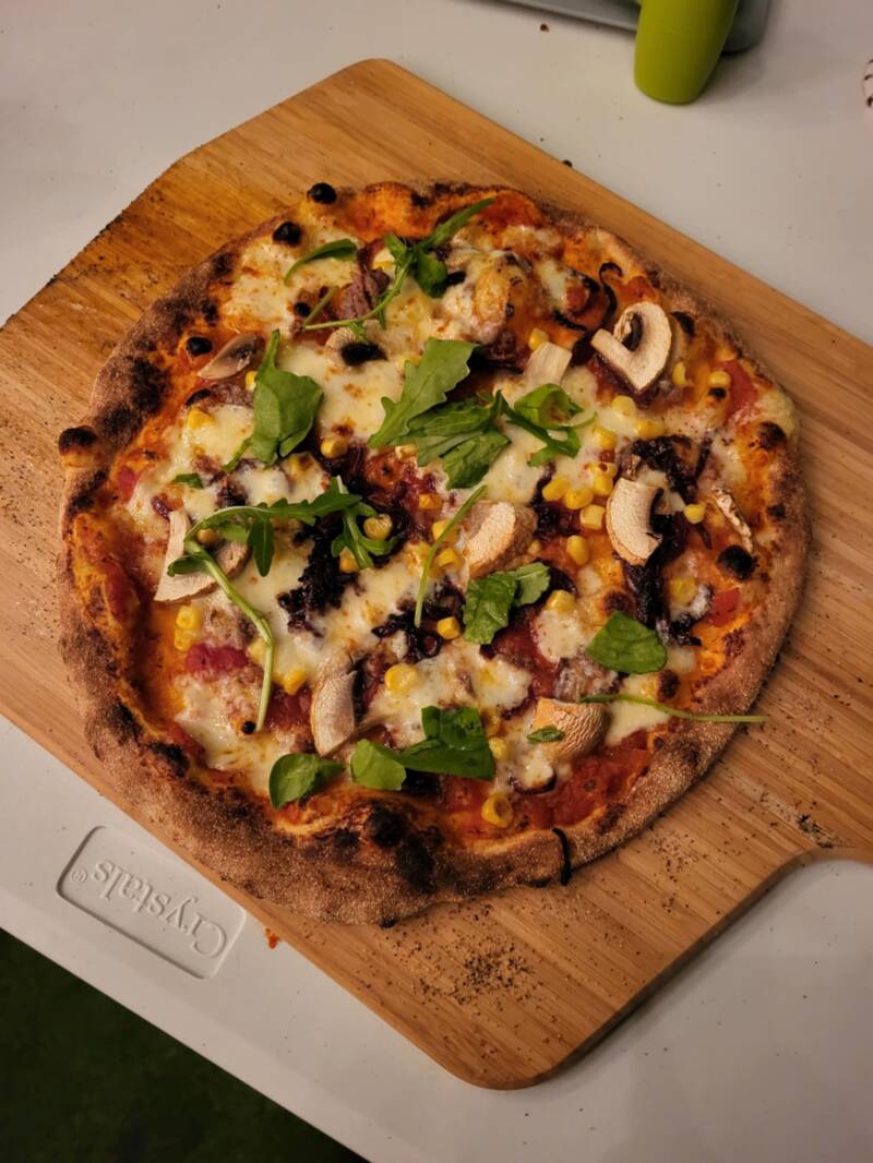 Many great topping choices inc this caramelised red onion, mushrooms, sweetcorn and fab Mozzarella and a bit of rocket